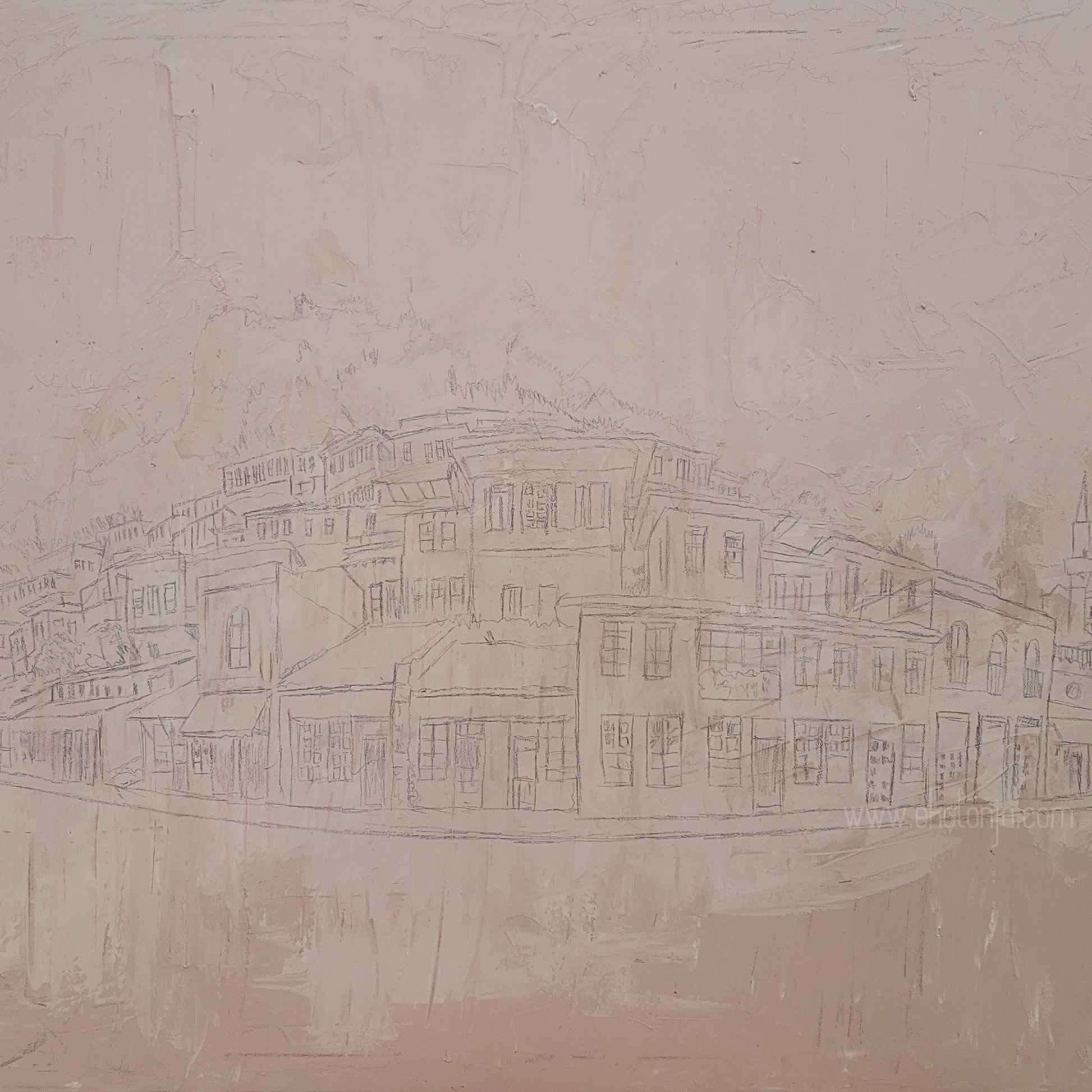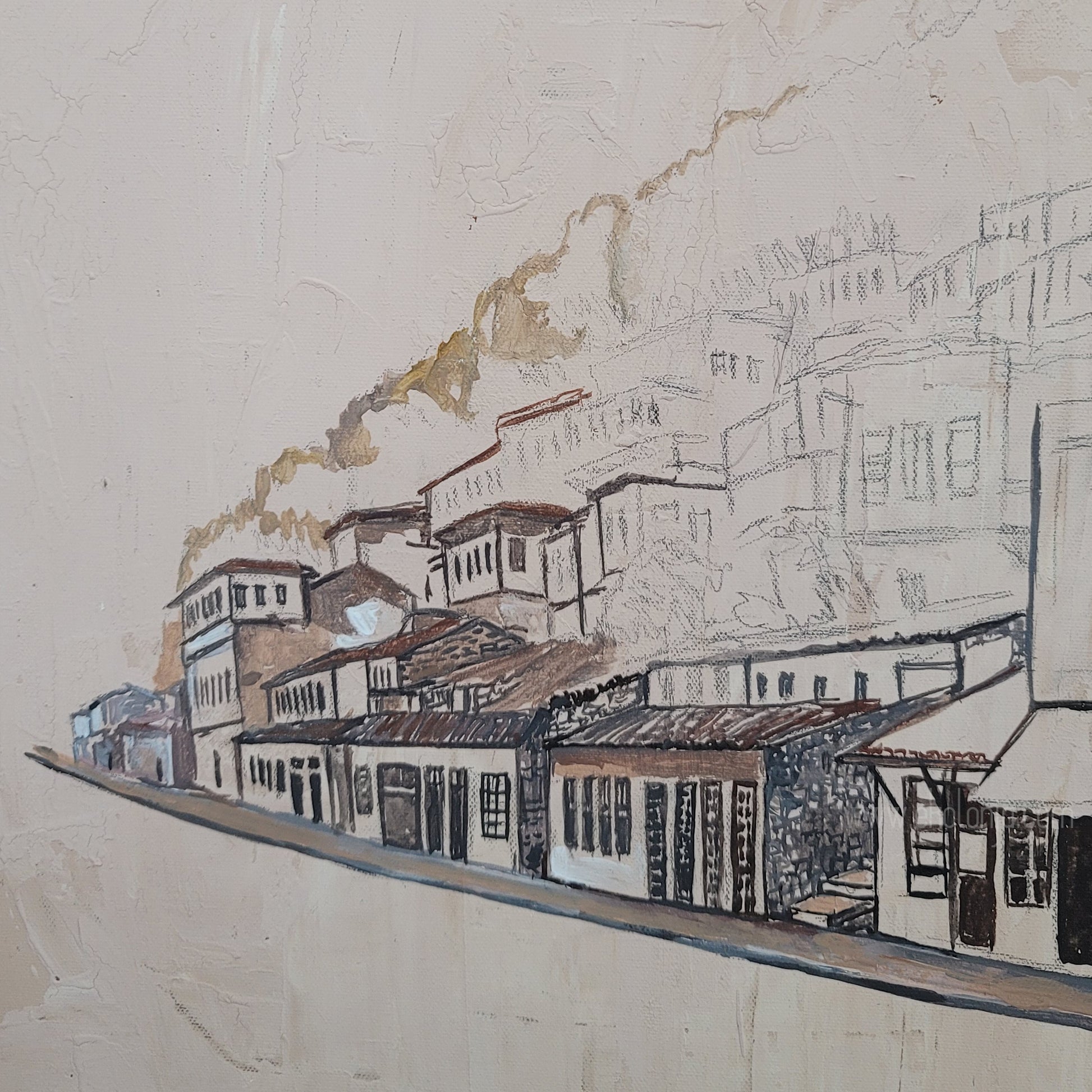 This original acrylic painting captures the iconic Mangalem neighborhood of Berat, a UNESCO World Heritage site. Measuring 100x70 cm, the artwork brings to life the traditional white Ottoman-style houses stacked along the hillside, rendered with expressive texture and fine detail.