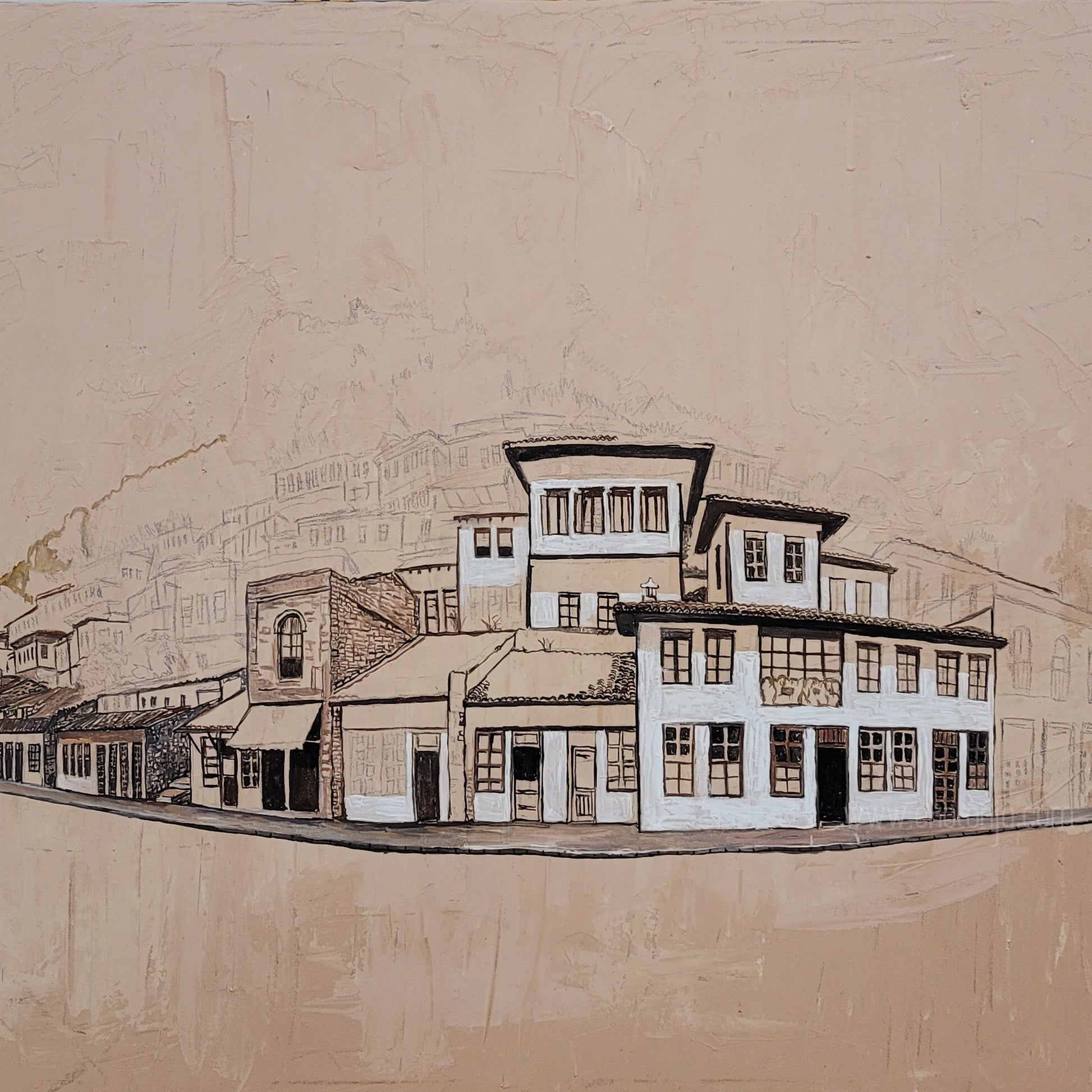 Created with acrylic paint on high-quality canvas, this piece celebrates the spirit of Albanian cultural heritage through warm earthy tones and harmonious composition. Ideal for art lovers who appreciate timeless architecture and handcrafted originals.
